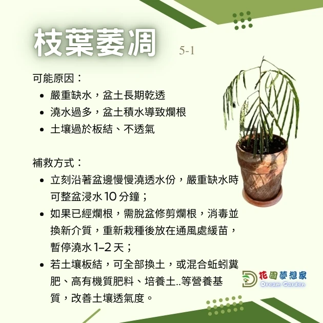 補救方式:停止澆水、墊高花盆助排水,修剪爛根並換新土,適度補充氮肥。