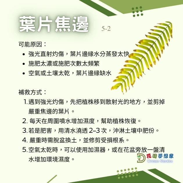 補救方式:移陰涼處並剪去焦邊葉片,清水澆透稀釋肥料,嚴重時需換土。