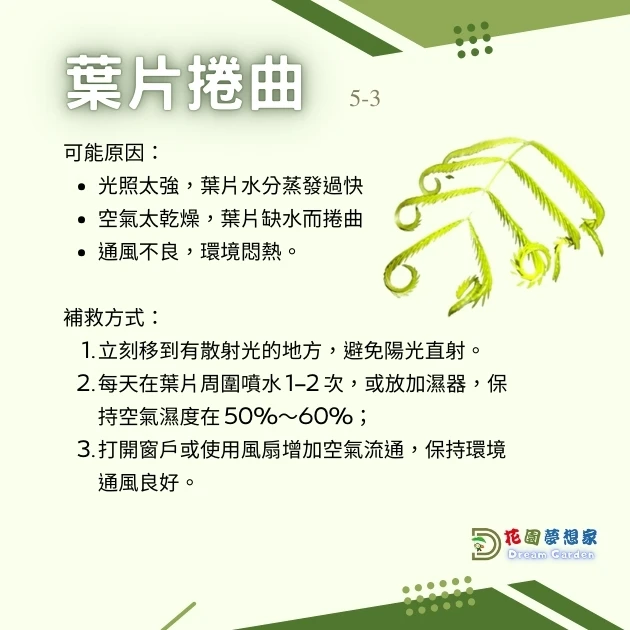 補救方式:移到散射光處,每天噴霧補濕,保持空氣濕度 50~60%,加強通風。