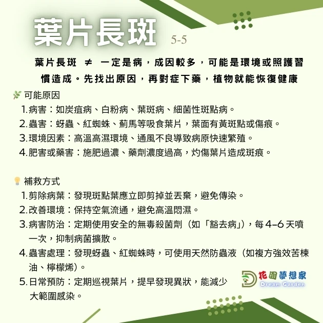 補救方式:剪除病葉,加強通風,必要時使用安全無毒殺菌劑(如「豁去病」)或天然防蟲液(如苦楝油)。
